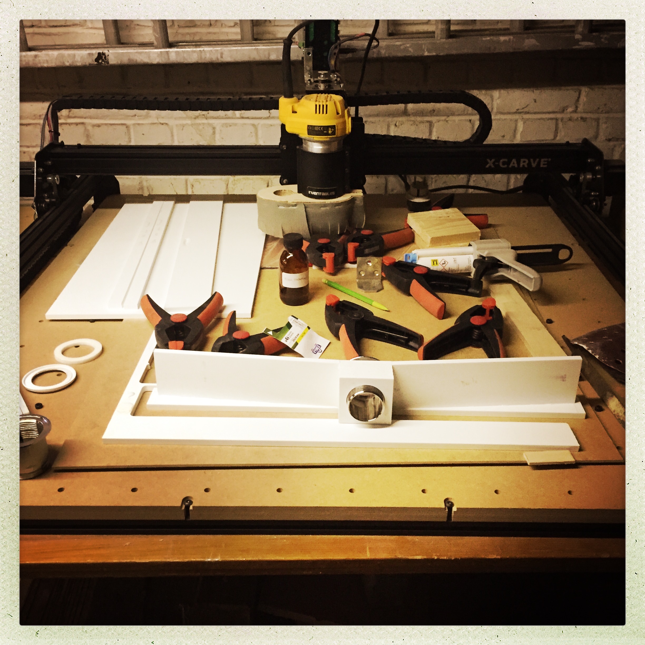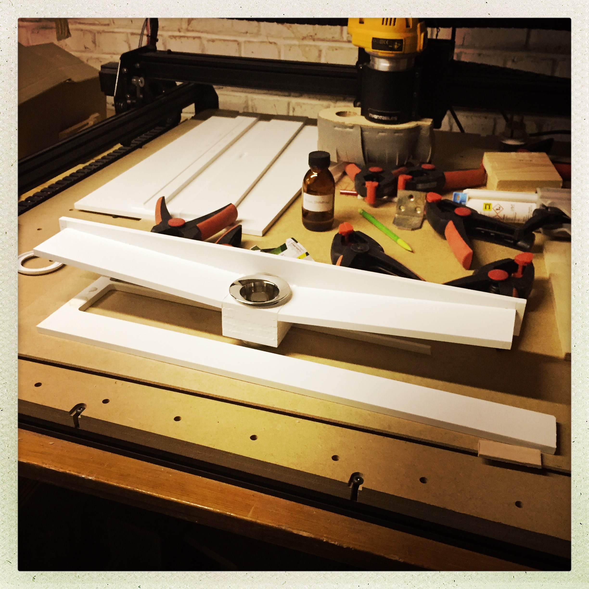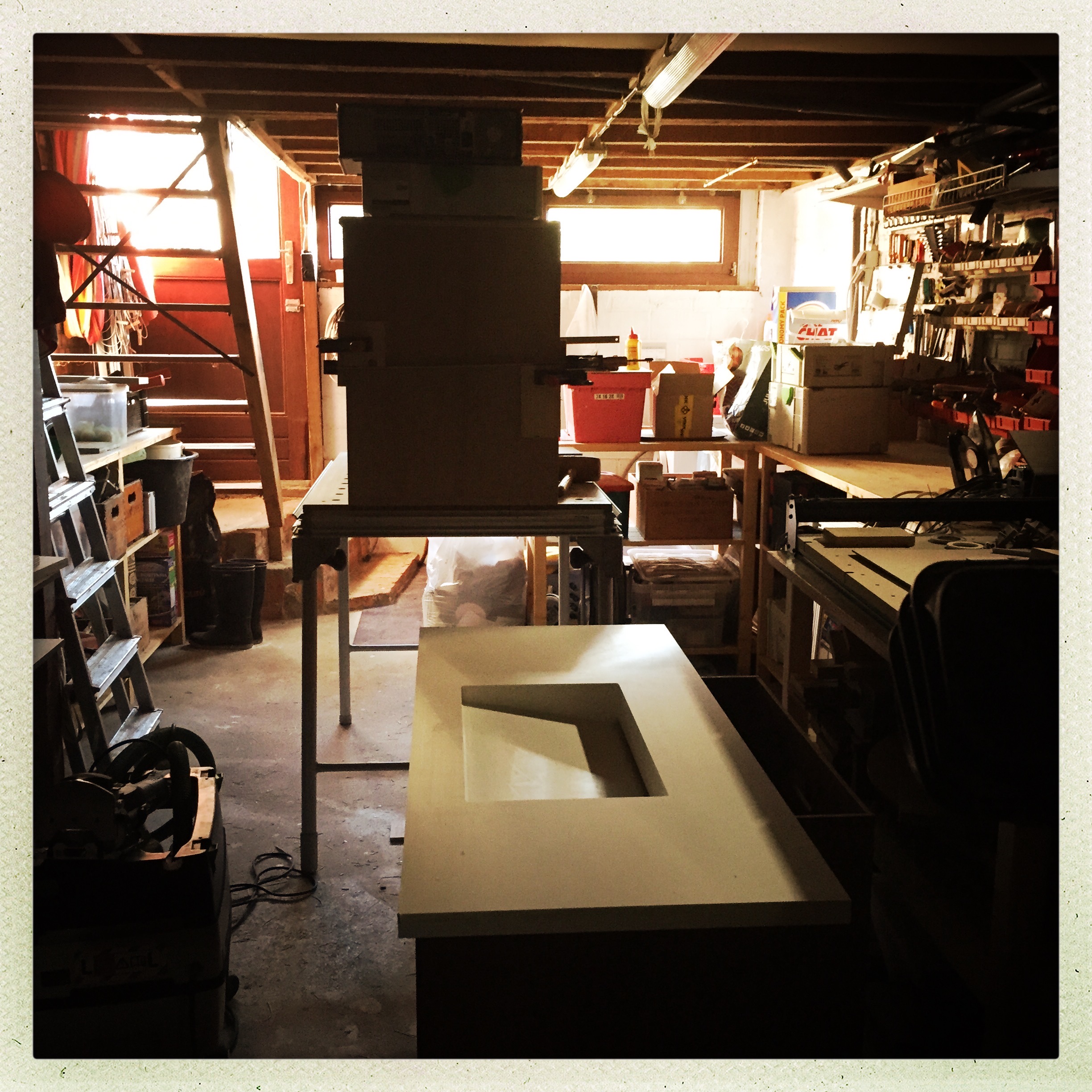 The idea was to cut some Corian and glue together the panels to make a nice ‘design’ sink at a fraction of the cost.